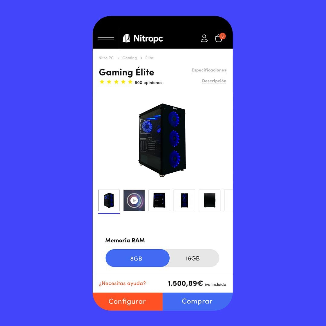 After the analysis, UX, design and development process, we created a new administrable online shop that seduces users and reflects this new, more visual and contemporary era for Nitropc. The result is a new eCommerce website that is very intuitive for users and has a carefully crafted, attractive look for gamers and tech-lovers who value quality, professionalism and custom Nitropc set-ups.