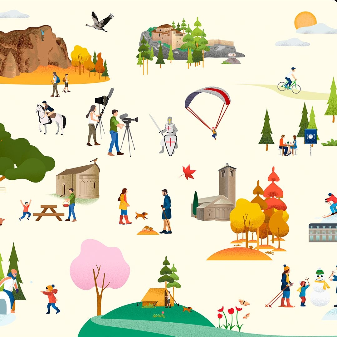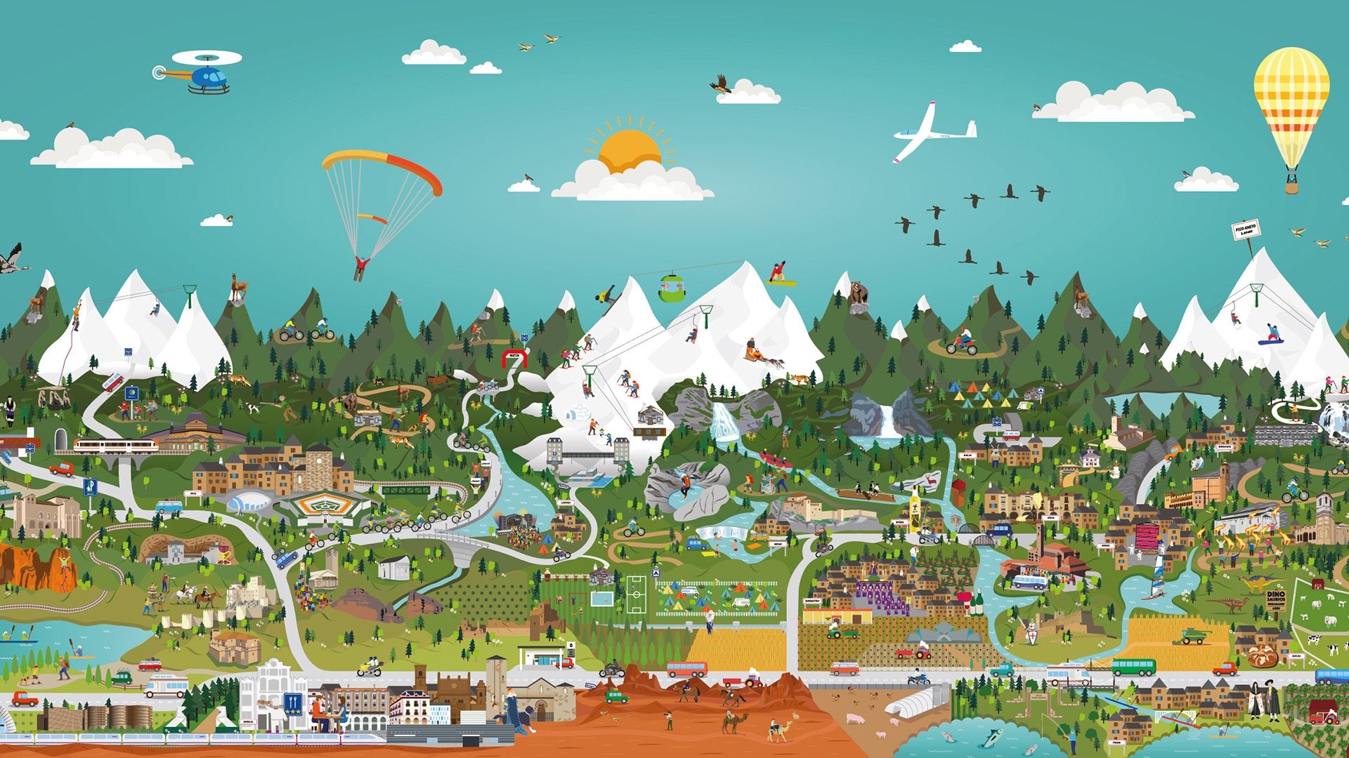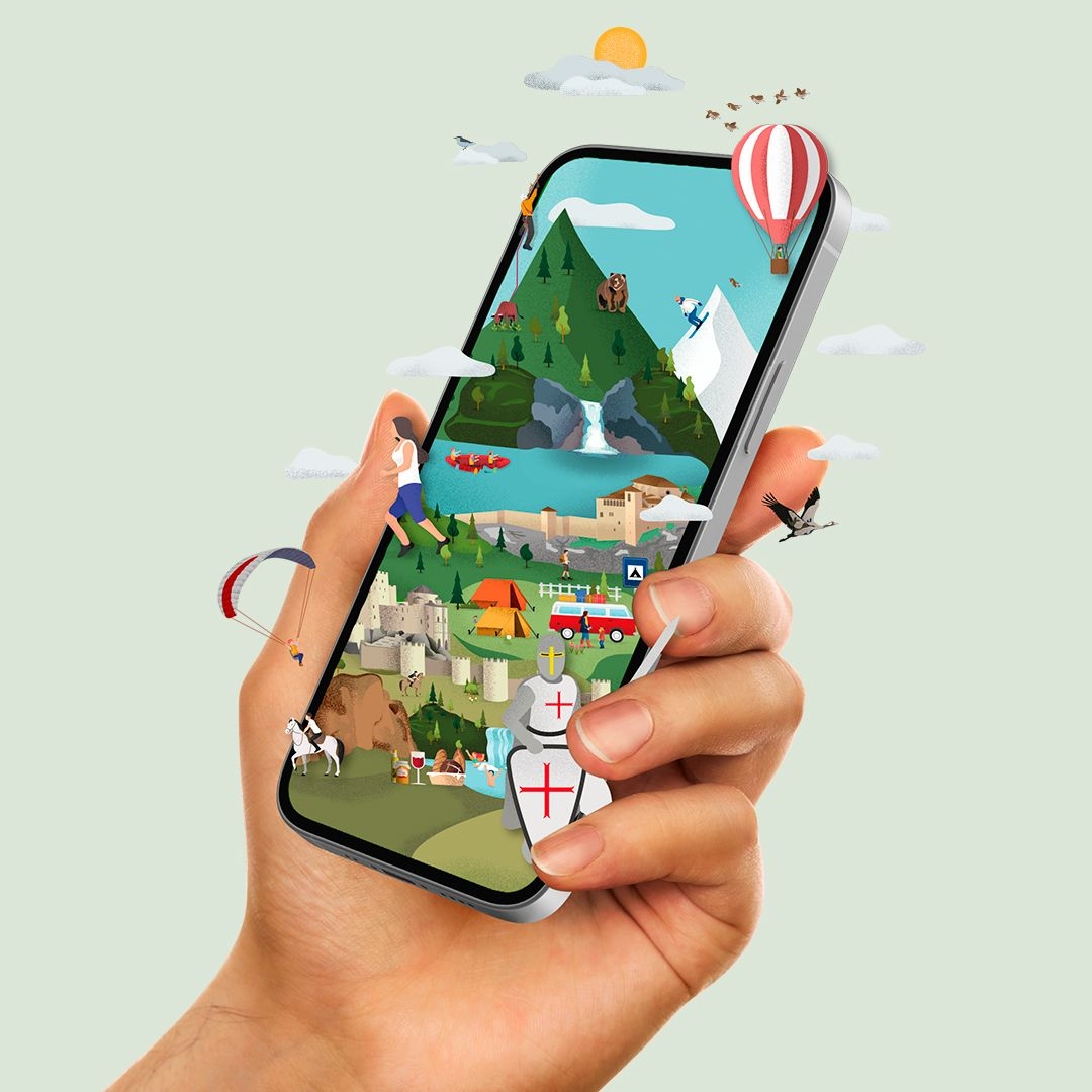 Con el objetivo de crear una imagen inolvidable para Huesca La Magia, diseñamos un mural que recoge toda la esencia de la identidad de la marca. Seleccionamos una muestra representativa de los principales atractivos turísticos de Huesca y los ilustramos en un mural, colocándolos tal y como estarían geolocalizados.