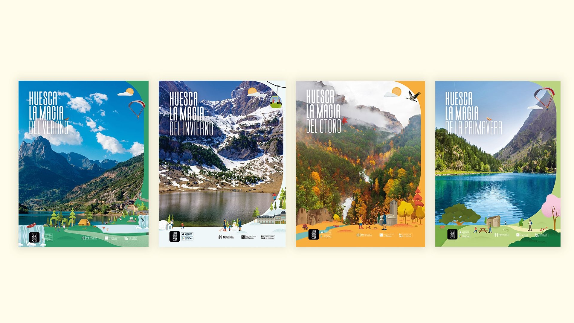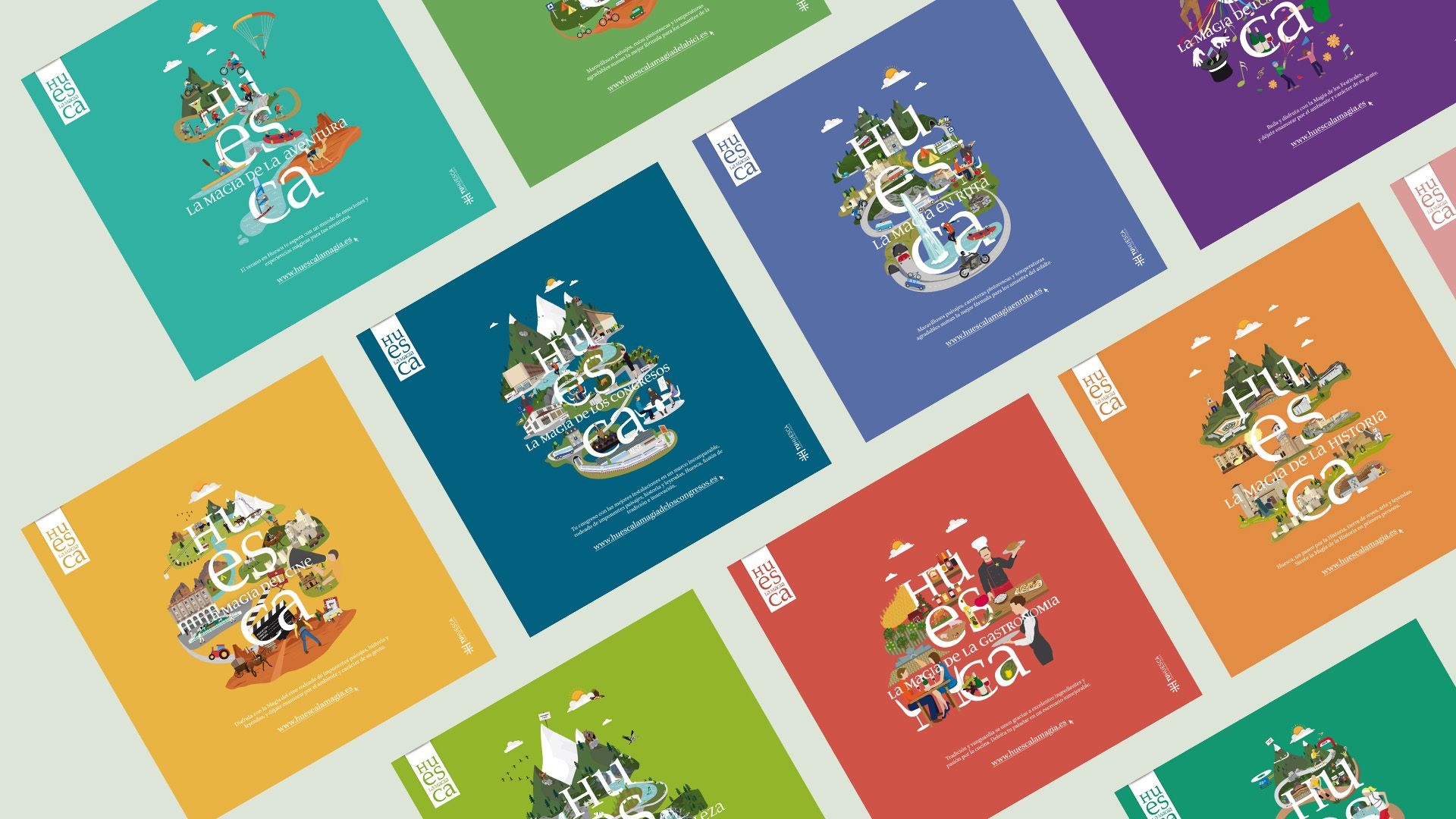 Desde el diseño del mural que ilustra los principales atractivos turísticos de Huesca, la imagen de Huesca La Magia ha estado en constante evolución. Se ha ido actualizando en cada nuevo reto que ha surgido, creándose segmentaciones que adaptan la imagen de marca a diferentes temáticas. Gracias a estas creatividades, Huesca La Magia se convierte en una marca viva, presente en todos y cada uno de los sectores relacionados con el turismo de la provincia.