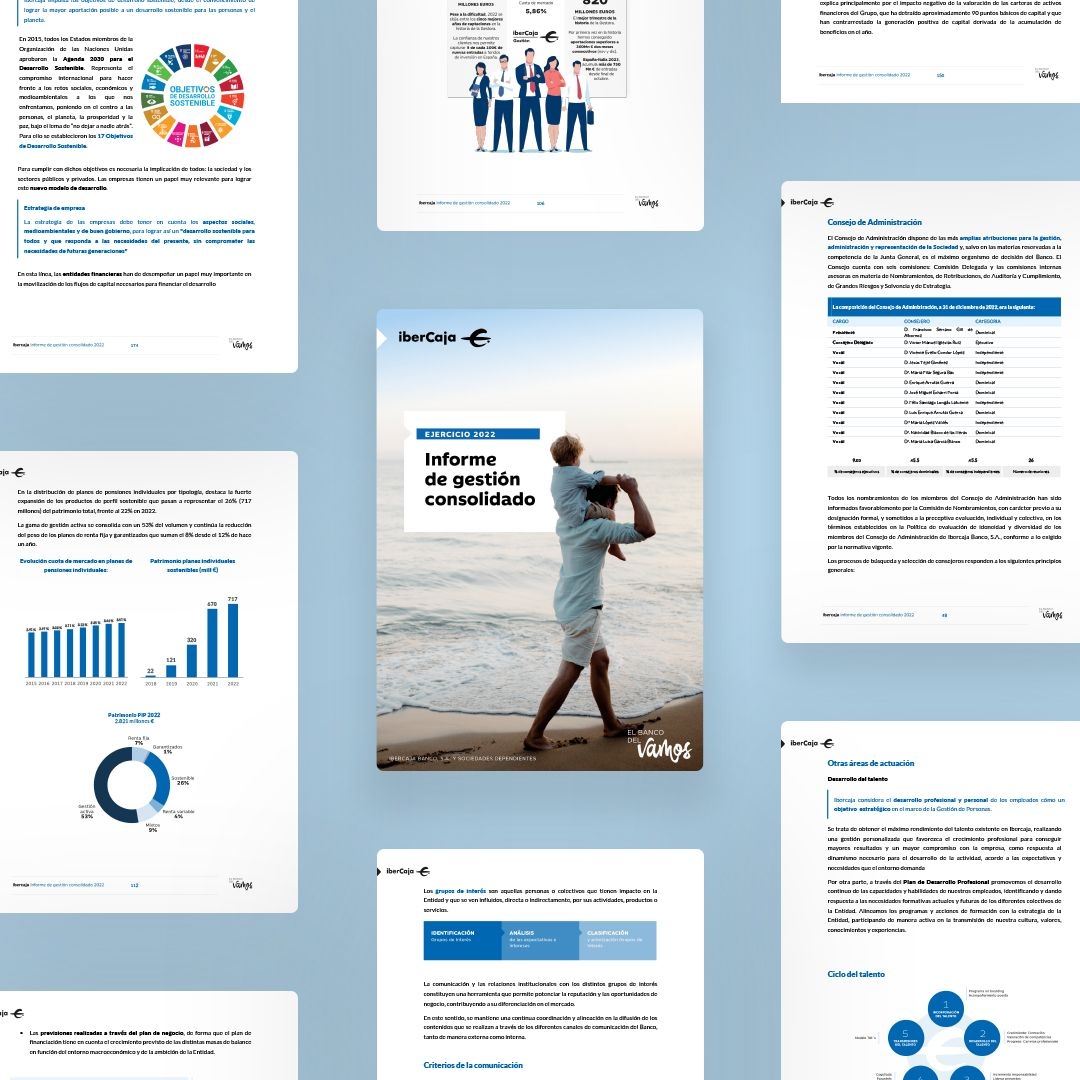 El crecimiento de la colaboración con el área interna de Ibercaja ha ido mucho más allá, puesto que nos ha permitido alcanzar nuevos desafíos como el Informe de Gestión consolidado: un documento clave del grupo que muestra una visión global de las líneas estratégicas, actividades, modelo de negocio y resultados financieros del Grupo Ibercaja.