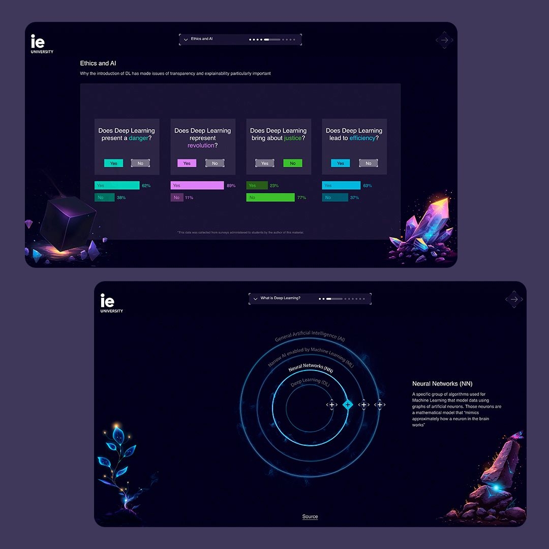 Trabajamos con el equipo de Digital Learning de IE University para crear una experiencia formativa única para el estudio de Deep Learning. Analizamos la información y el proceso que tenían que seguir los alumnos de este módulo para poder diseñar y crear una interfaz interactiva a través de inteligencia artificial que transforma el proceso de estudio en una inmersión hacia un mundo de fantasía y aventura llamado DeepLearnia. Este diseño experiencial transmite la apuesta por la digitalización y la innovación de la universidad y demuestra que una nueva forma de estudio es posible.