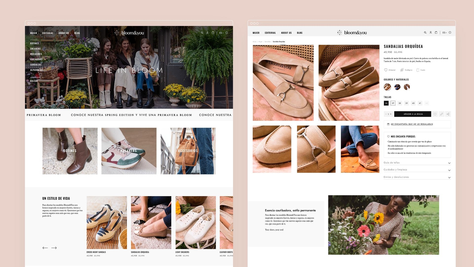 Bloom&You buscaba convertirse en una marca de referencia de calzado y accesorios y hacerse hueco en un mercado altamente competitivo. Para conseguirlo, necesitaba una imagen que proyectara sus valores, un discurso de marca que conectara con su público objetivo y una tienda online que transmitiera una personalidad de marca única y contara con una experiencia de compra fácil e intuitiva.